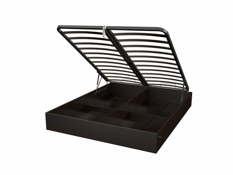 Сплошные и ламельные модели могут быть дополнены подъемным механизмом – специальные газлифты позволяют легко поднять конструкцию с матрасом, они крепятся на раму основания и царги кровати. Простой доступ к бельевым ящикам помогает сэкономить место в спальне.